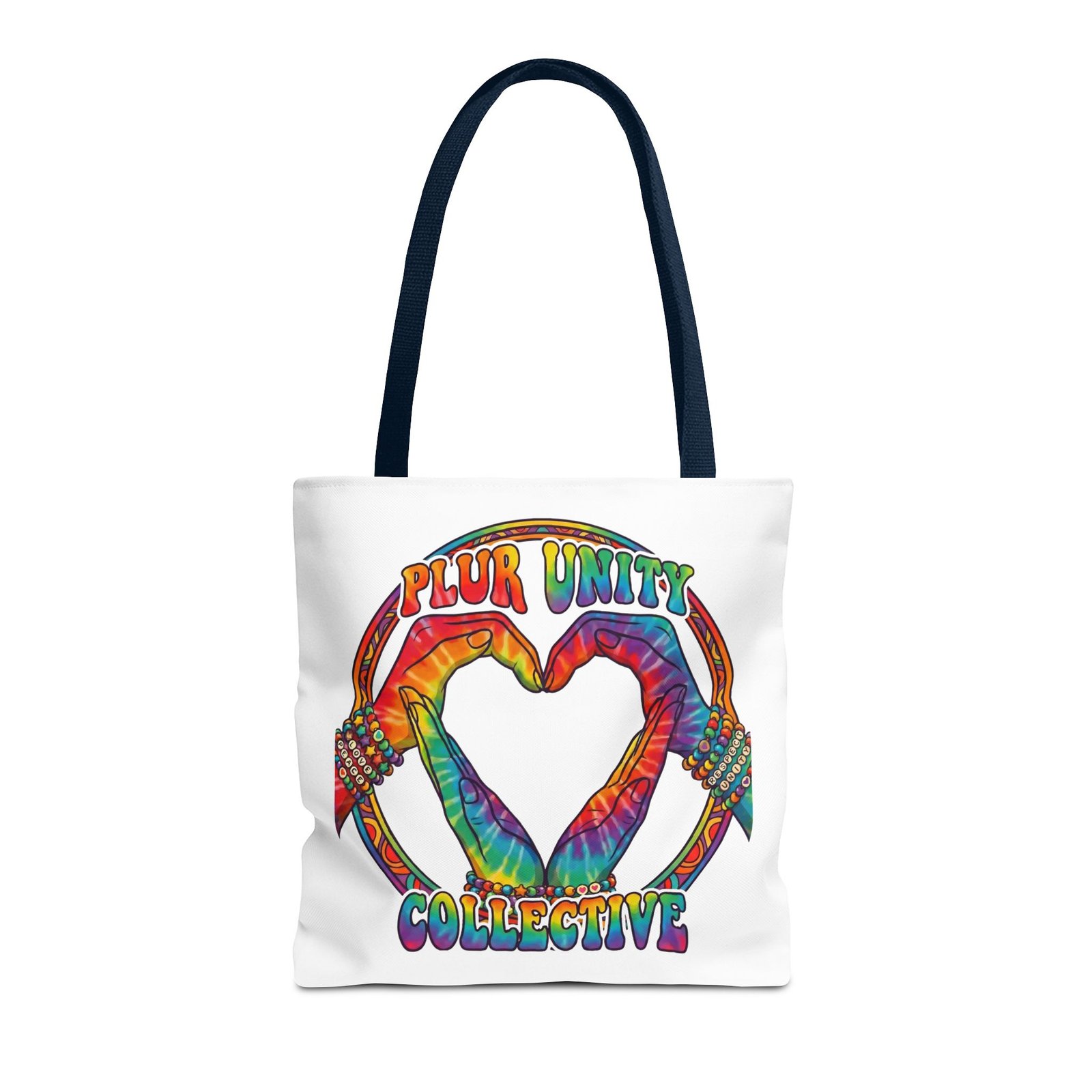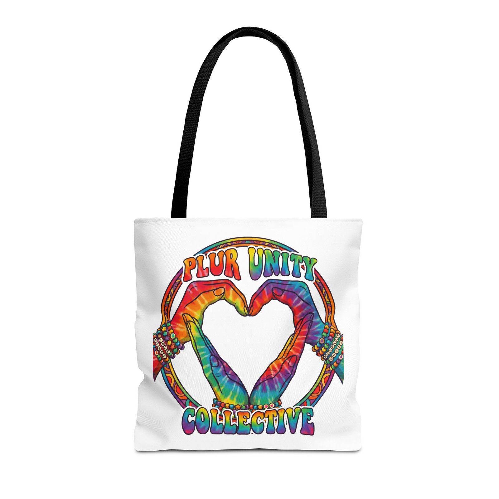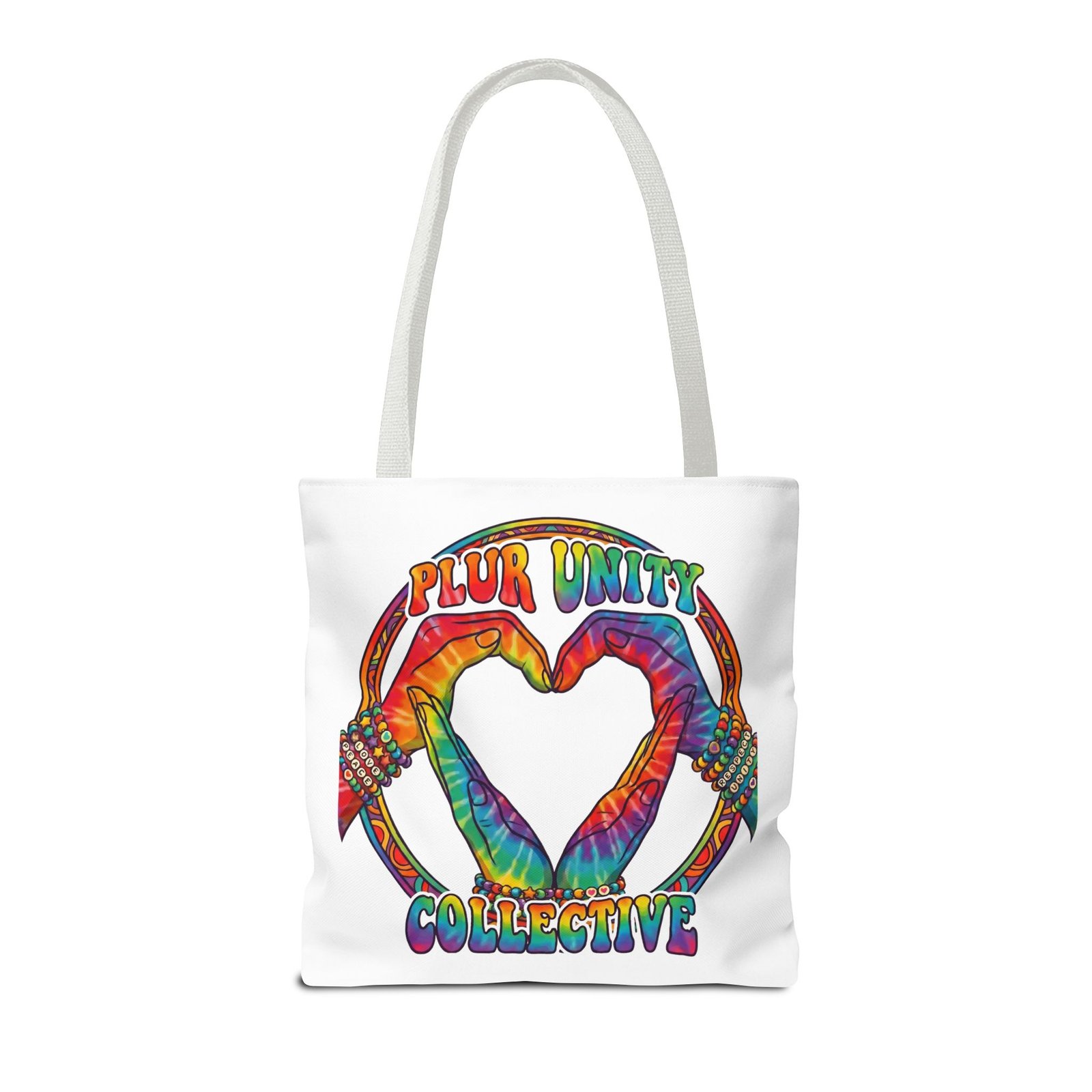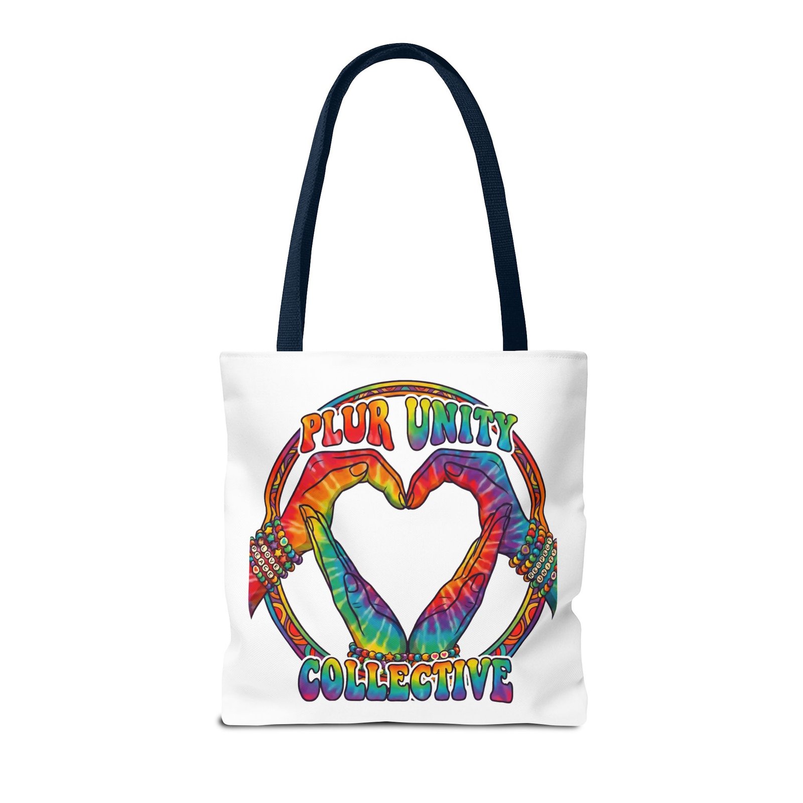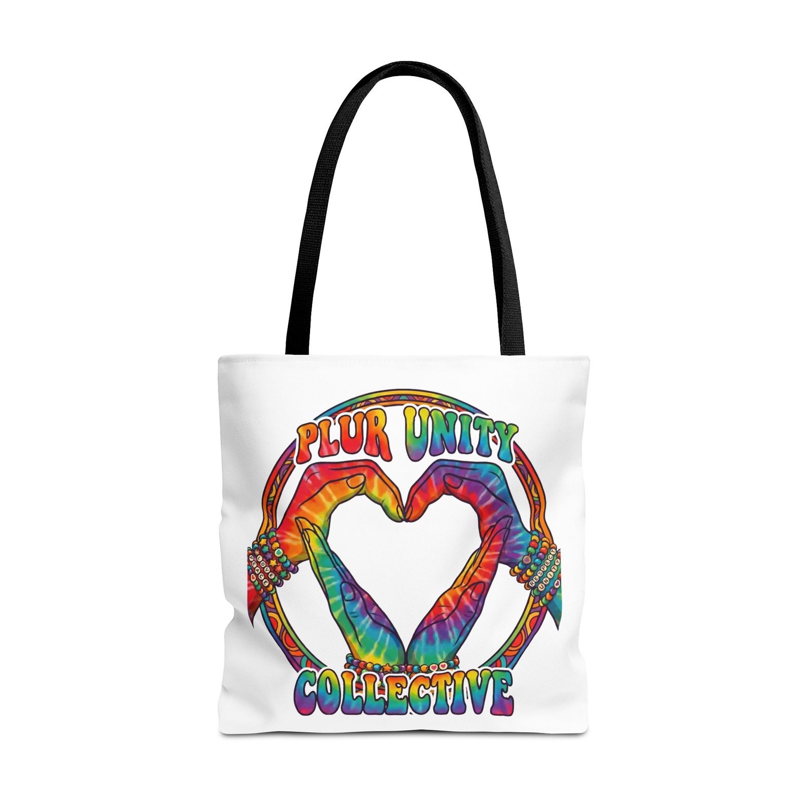 Bright, roomy, and built to carry both essentials and pride. This polyester tote features a vivid tie-dye inspired design of two hands forming a heart inside a rainbow ring, with “PLUR UNITY COLLECTIVE” rendered in joyful, colorful lettering. Lightweight yet durable, it holds its shape and dries fast—great for festival days, market runs, or everyday errands. The boxed corners add volume for bulky items, reinforced handle stitching gives confidence when you pack it full, and the interior non-woven laminate helps protect contents. Choose from five handle colors and three sizes to match your style and needs.