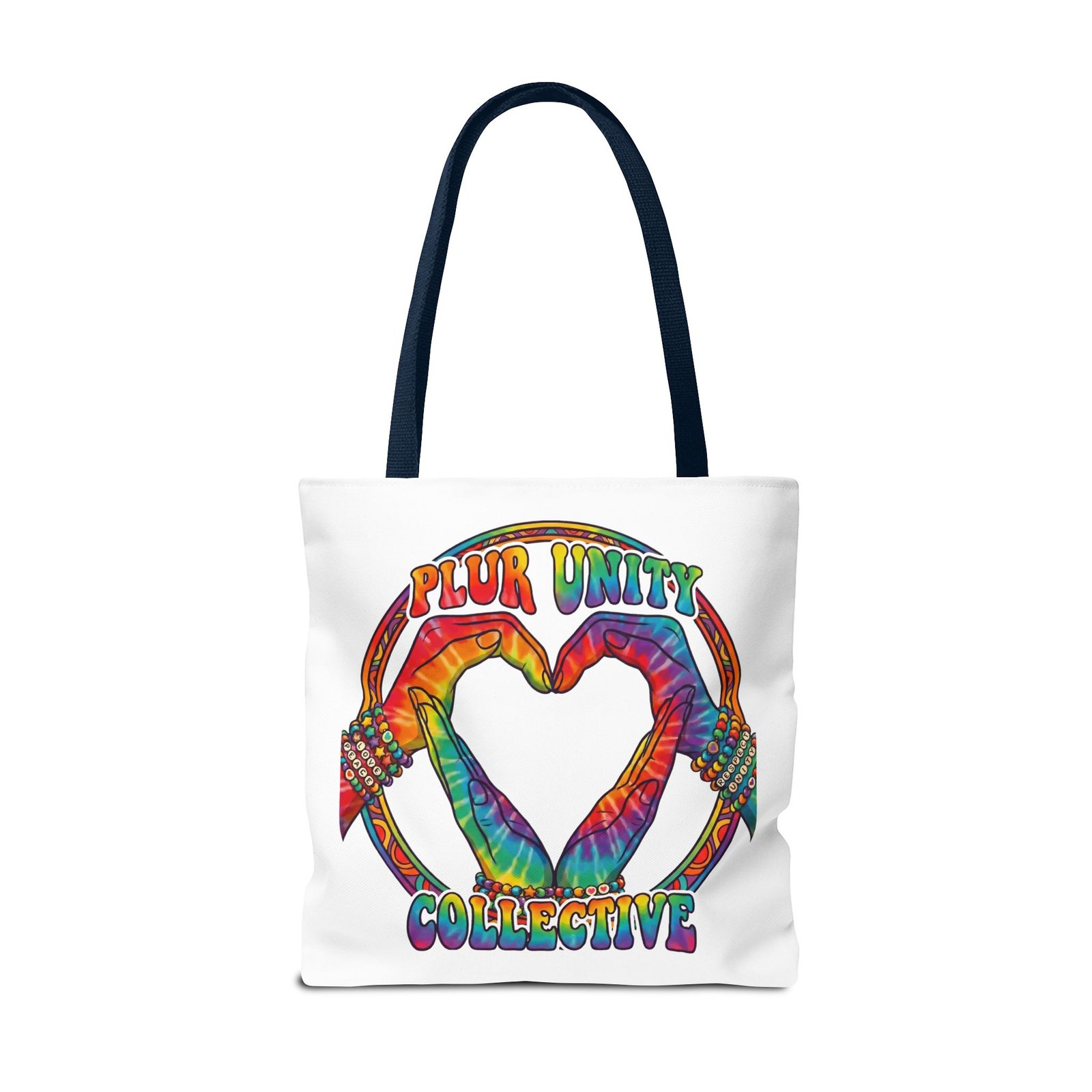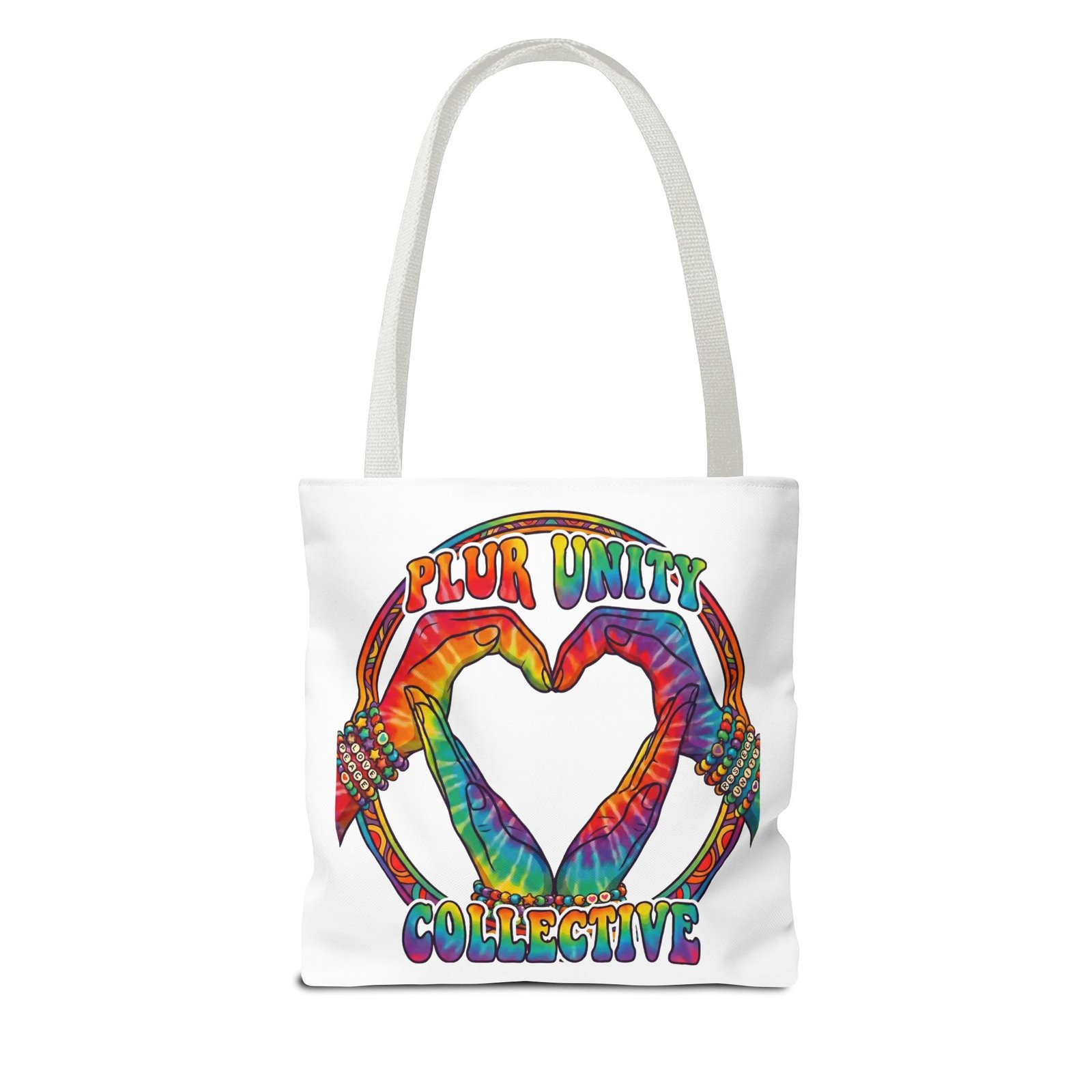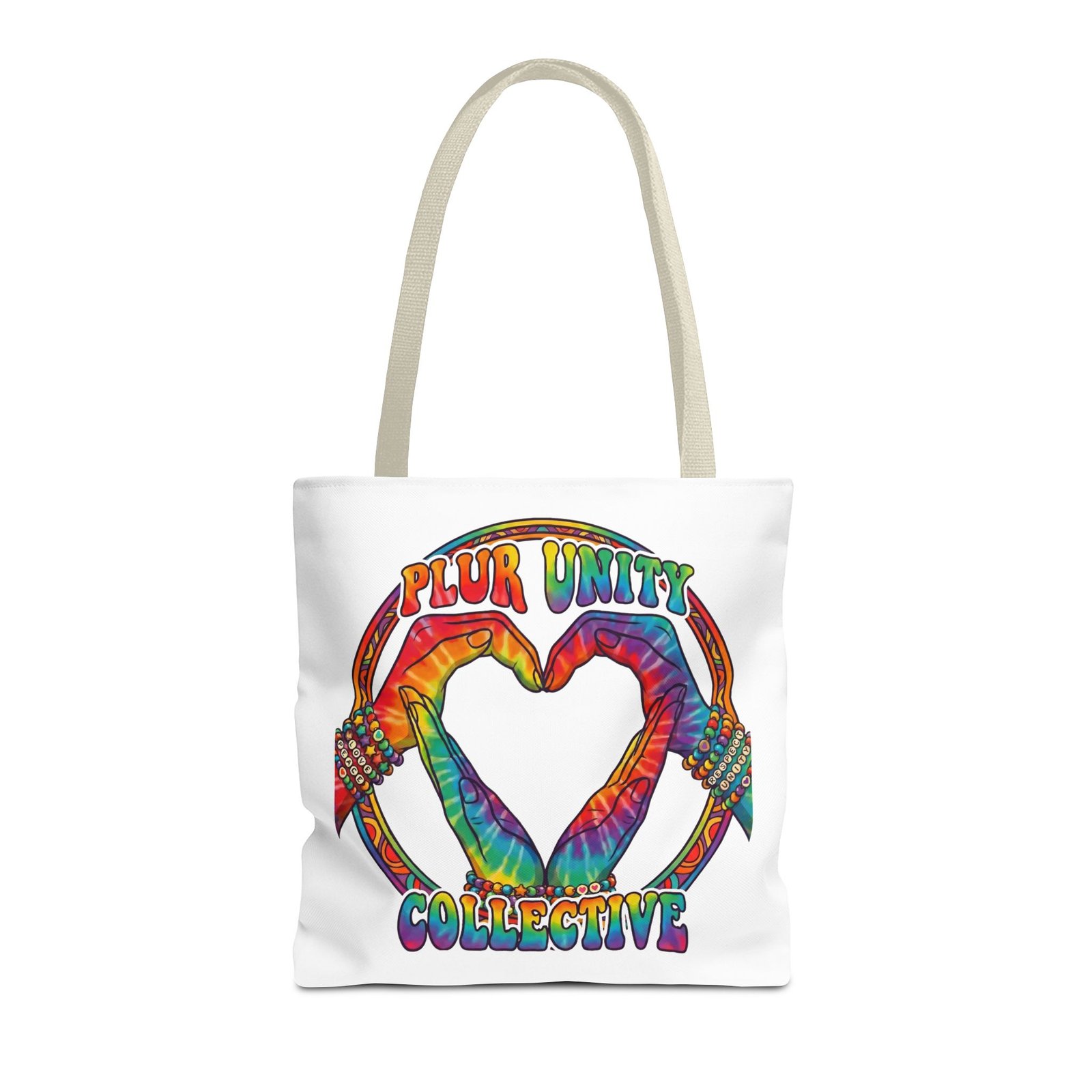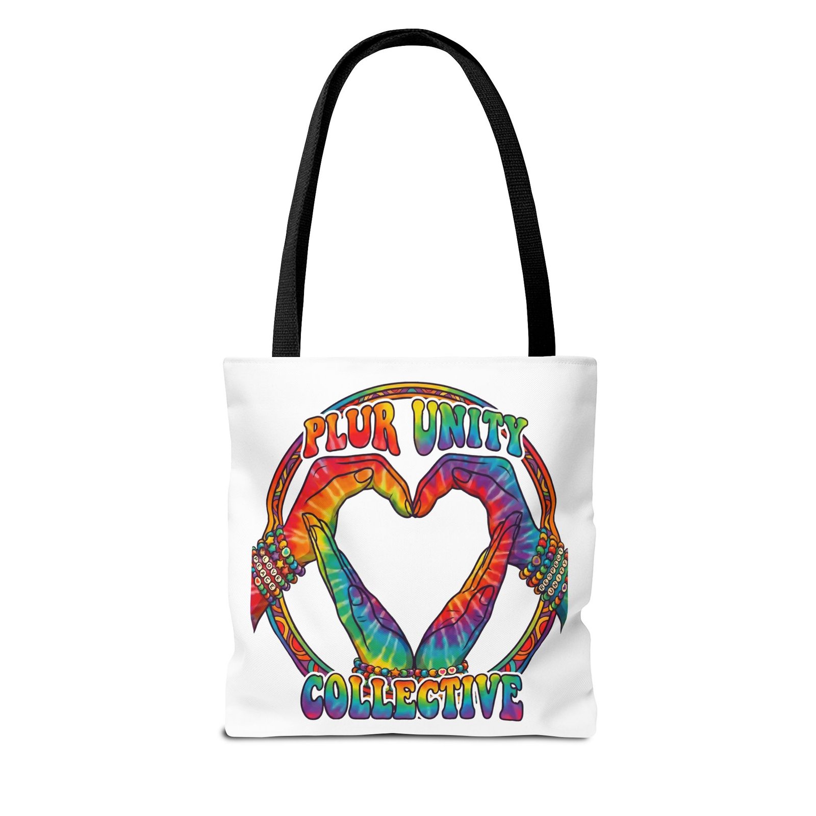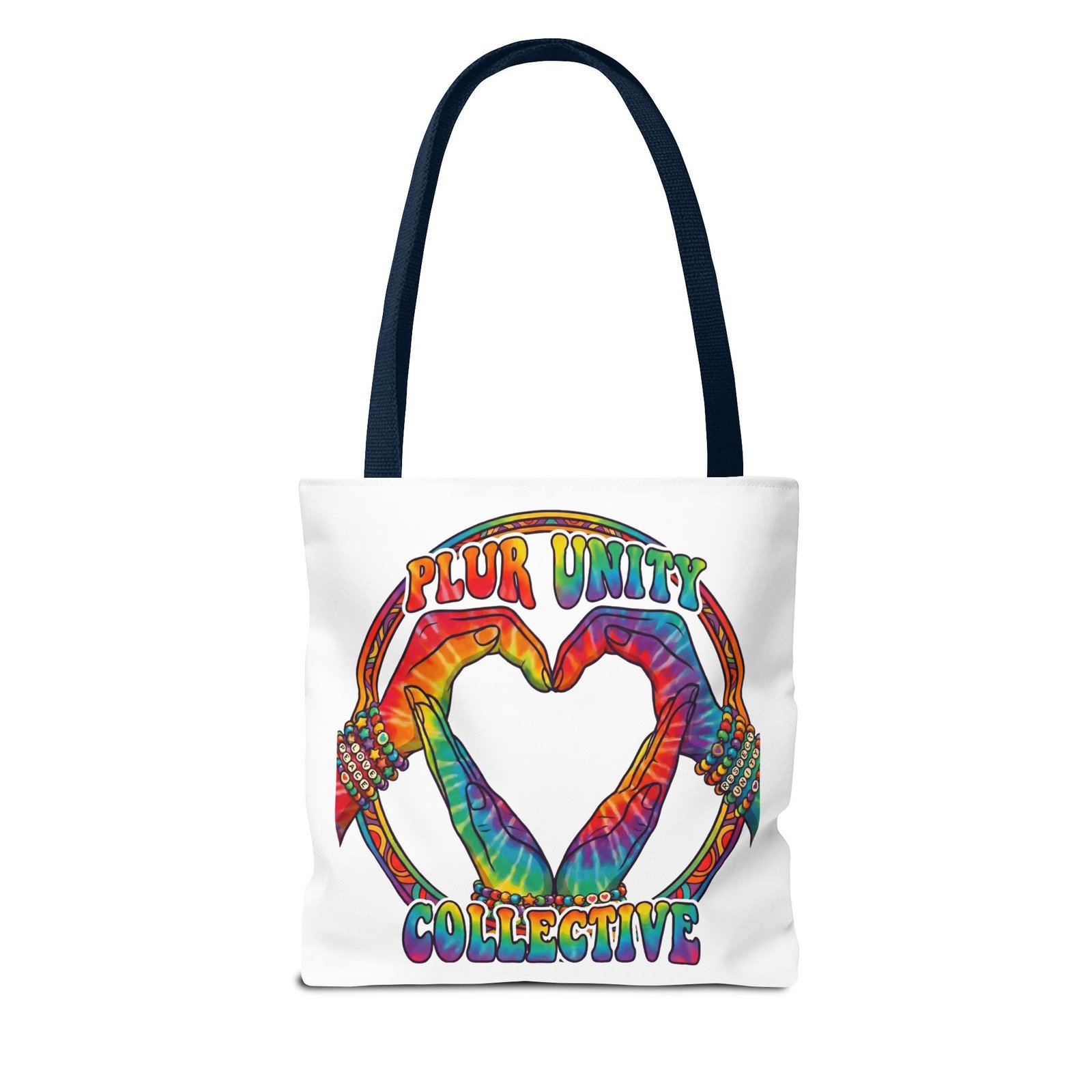 Bright, roomy, and built to carry both essentials and pride. This polyester tote features a vivid tie-dye inspired design of two hands forming a heart inside a rainbow ring, with “PLUR UNITY COLLECTIVE” rendered in joyful, colorful lettering. Lightweight yet durable, it holds its shape and dries fast—great for festival days, market runs, or everyday errands. The boxed corners add volume for bulky items, reinforced handle stitching gives confidence when you pack it full, and the interior non-woven laminate helps protect contents. Choose from five handle colors and three sizes to match your style and needs.