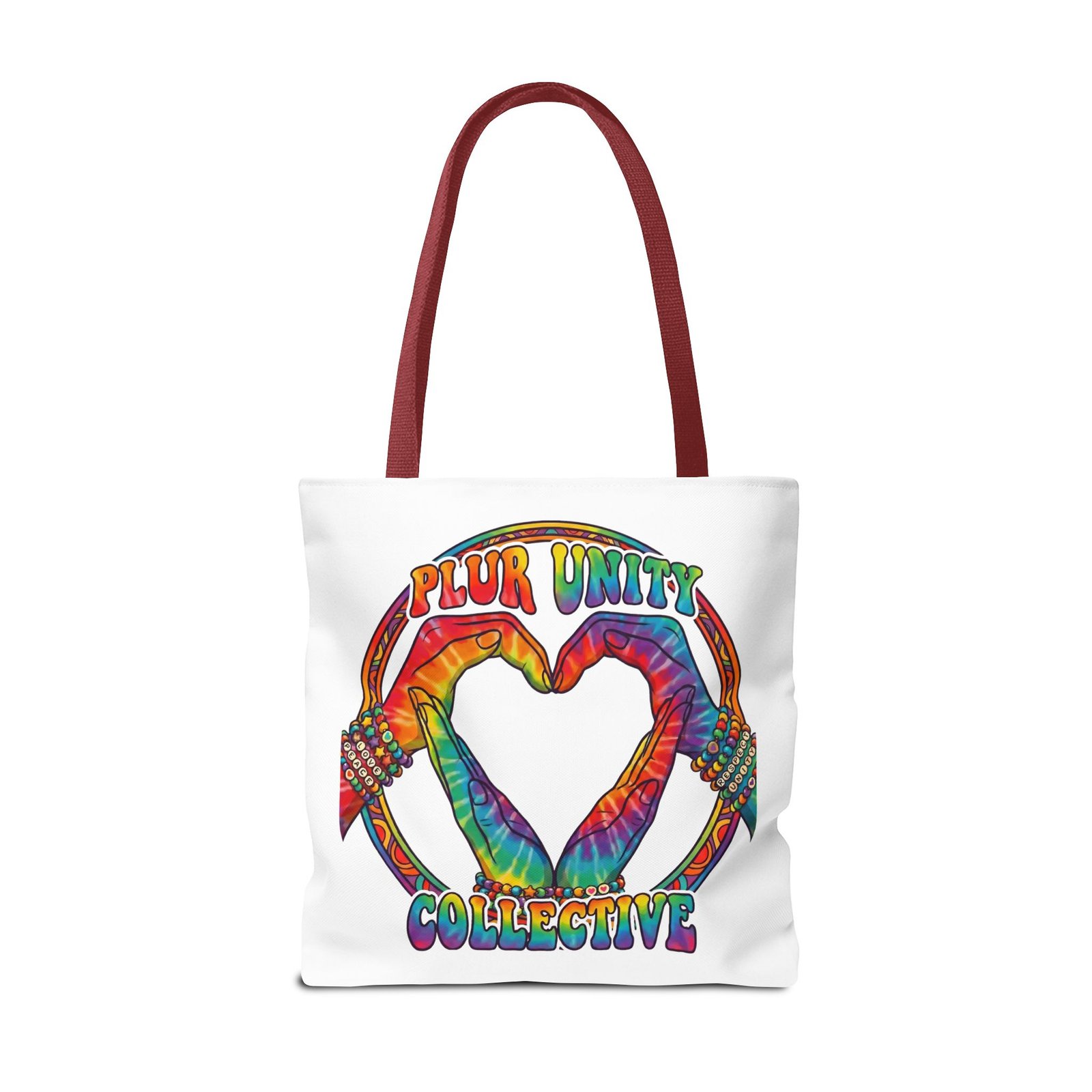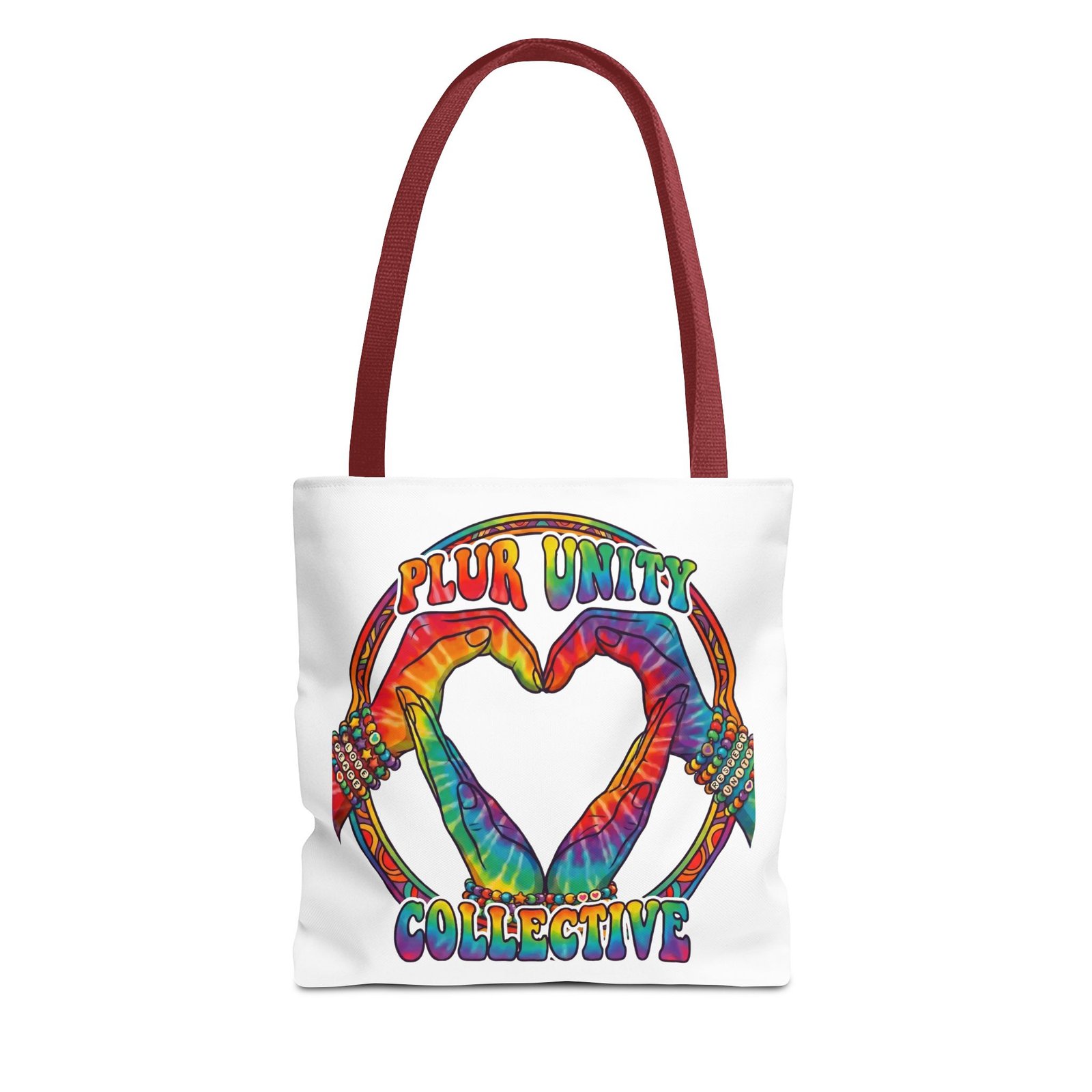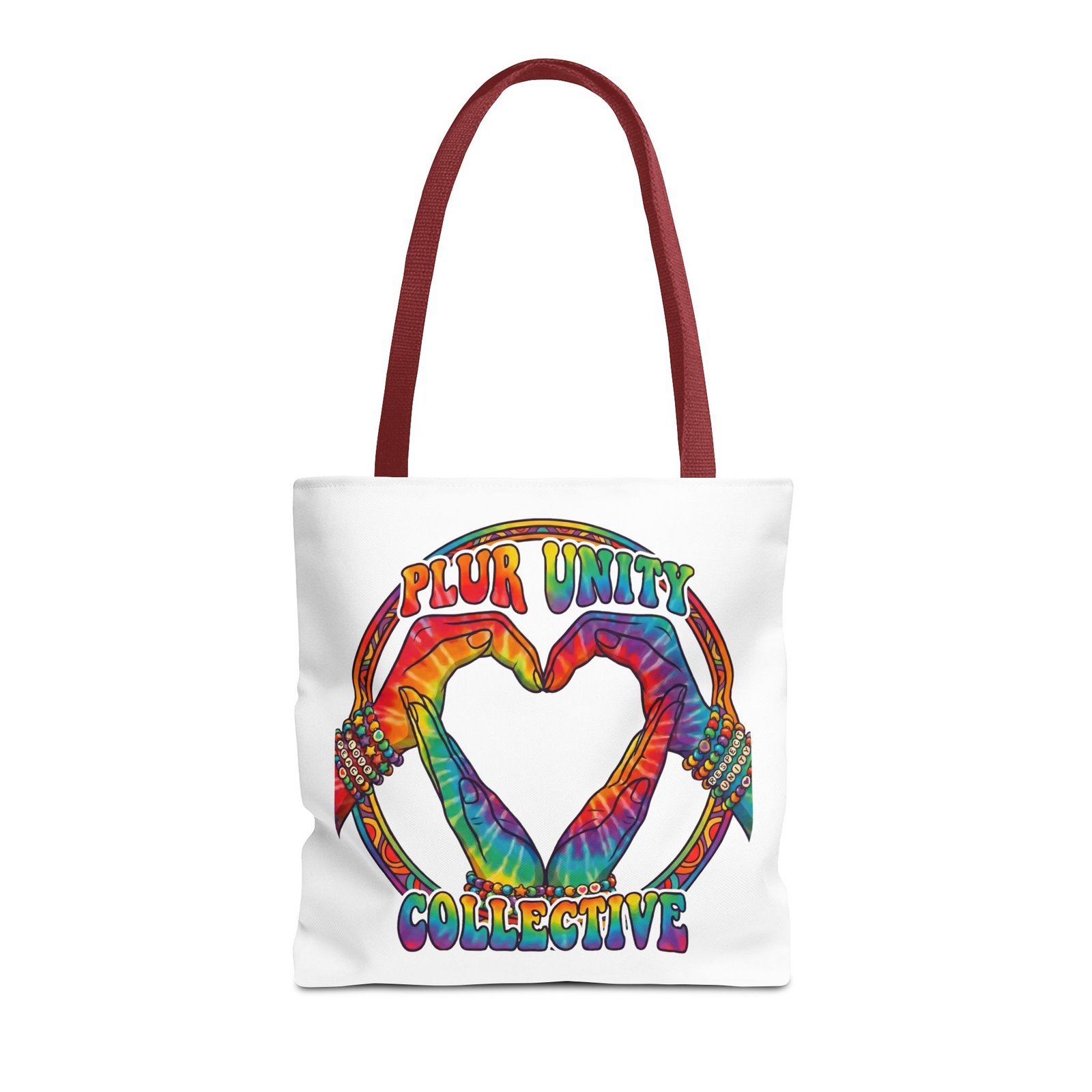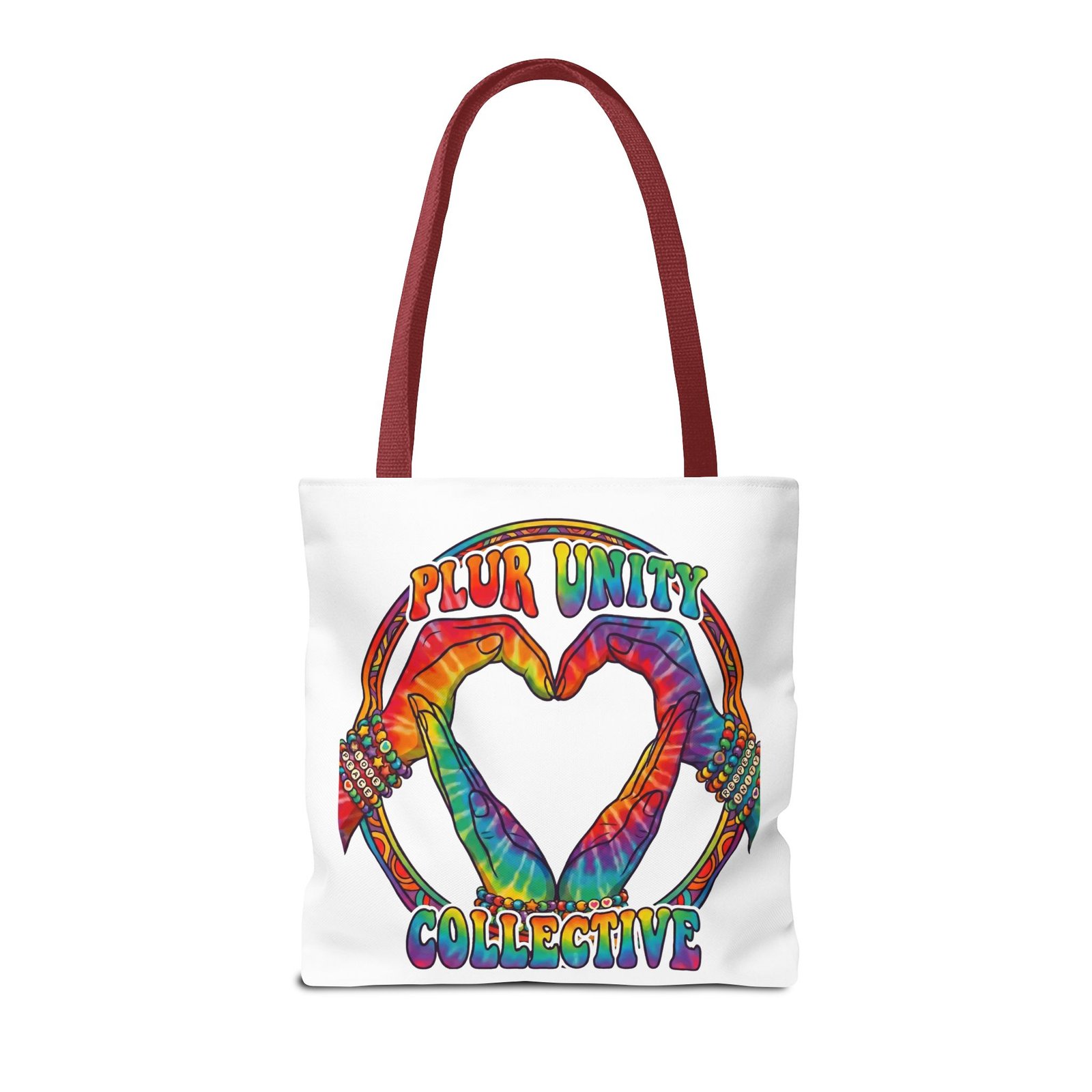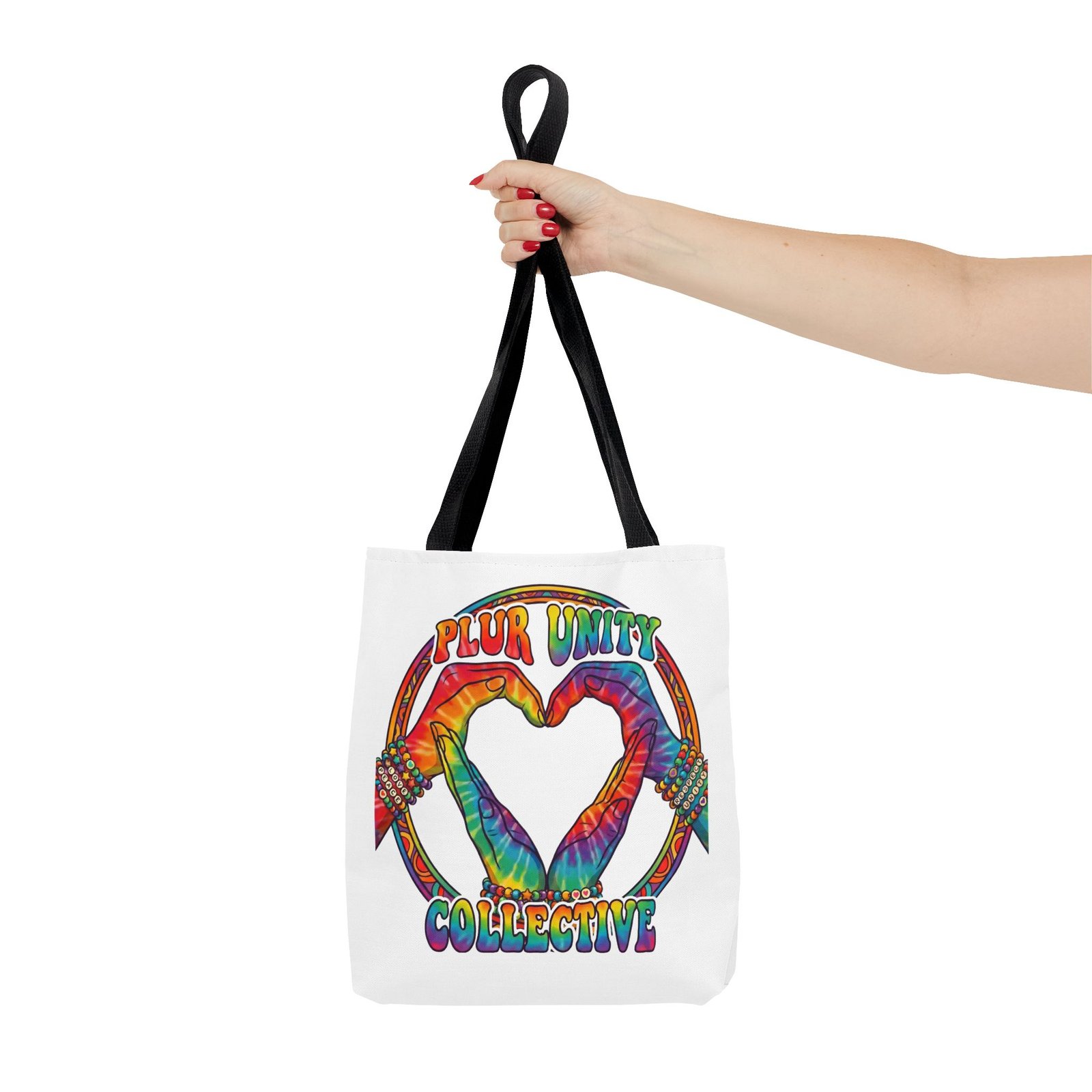 Bright, roomy, and built to carry both essentials and pride. This polyester tote features a vivid tie-dye inspired design of two hands forming a heart inside a rainbow ring, with “PLUR UNITY COLLECTIVE” rendered in joyful, colorful lettering. Lightweight yet durable, it holds its shape and dries fast—great for festival days, market runs, or everyday errands. The boxed corners add volume for bulky items, reinforced handle stitching gives confidence when you pack it full, and the interior non-woven laminate helps protect contents. Choose from five handle colors and three sizes to match your style and needs.