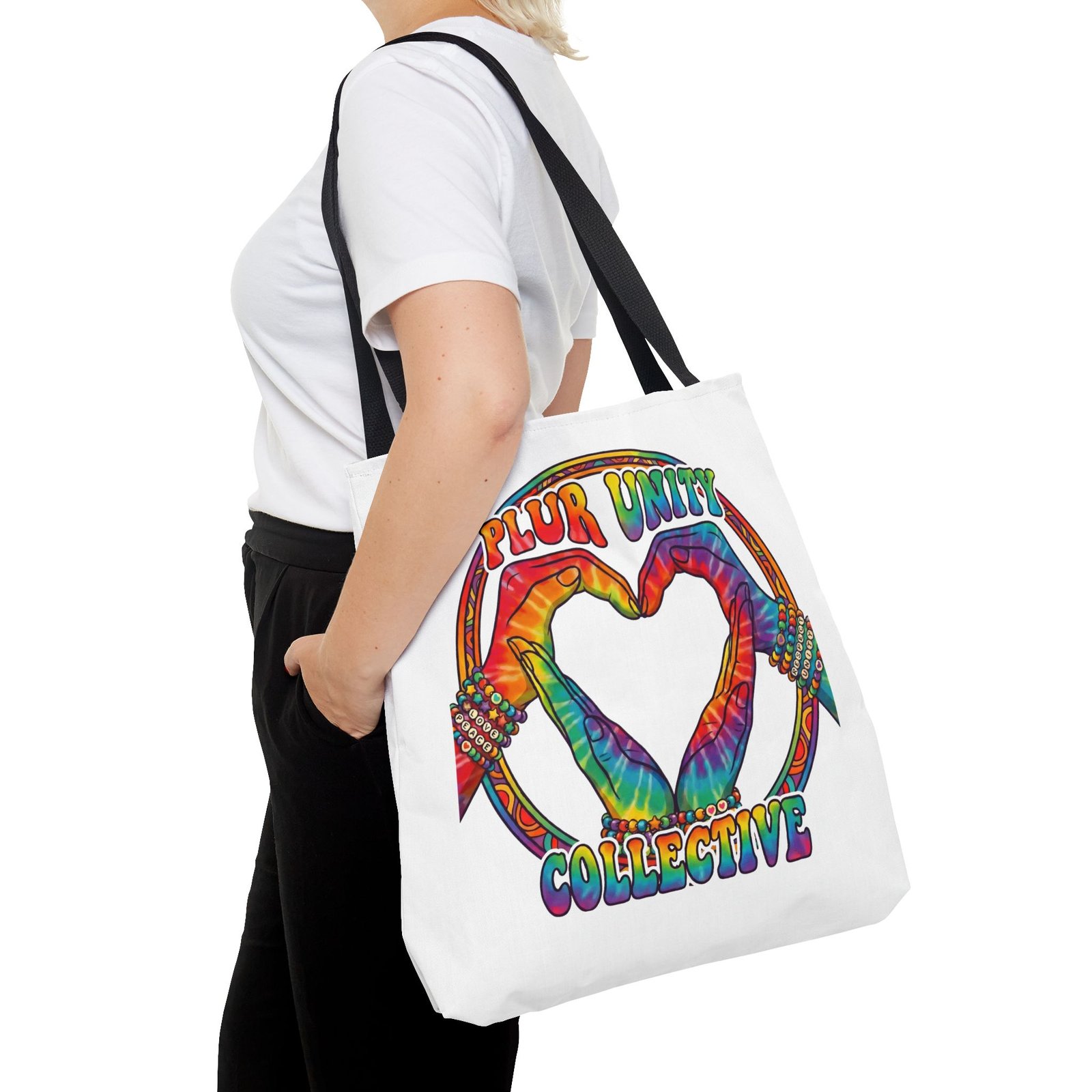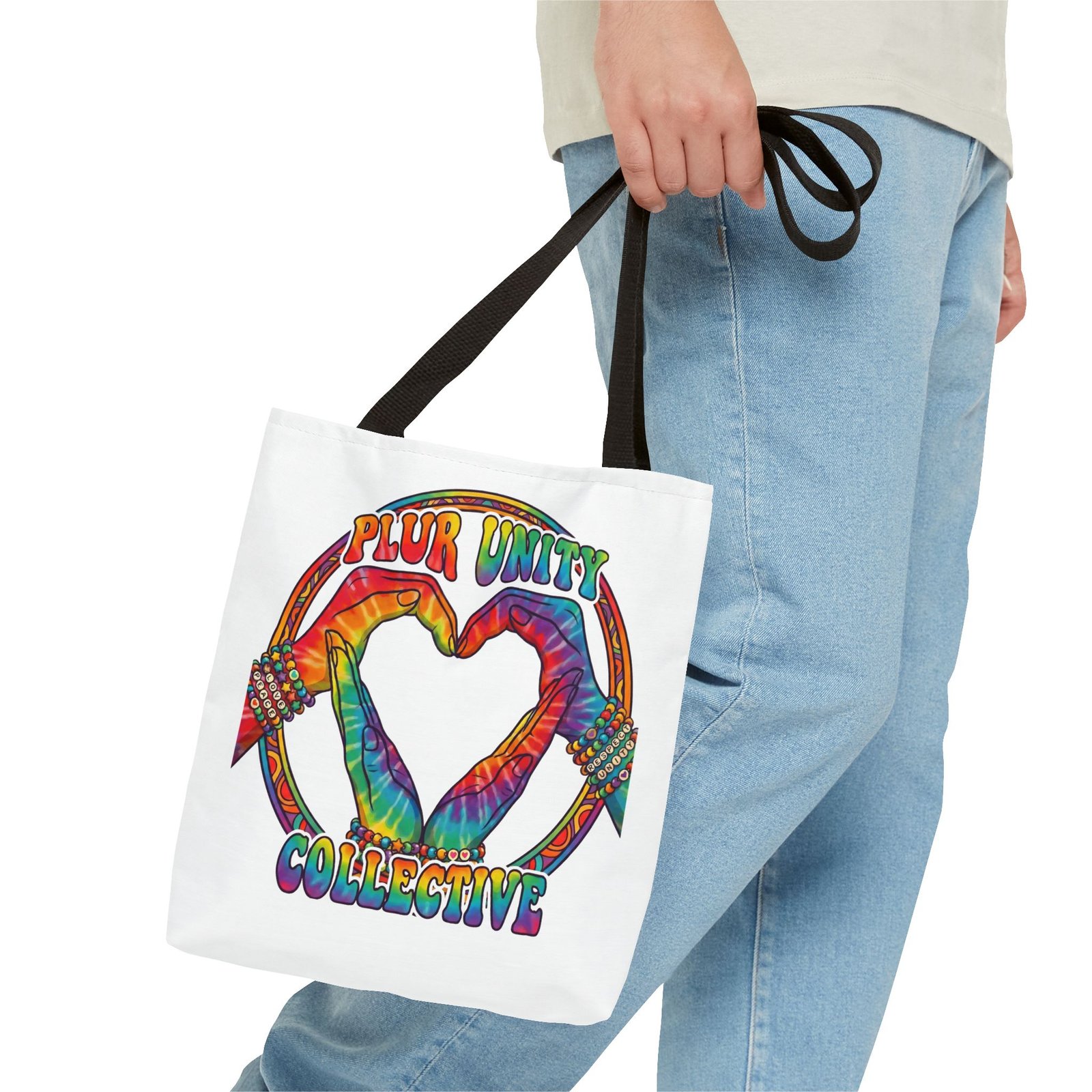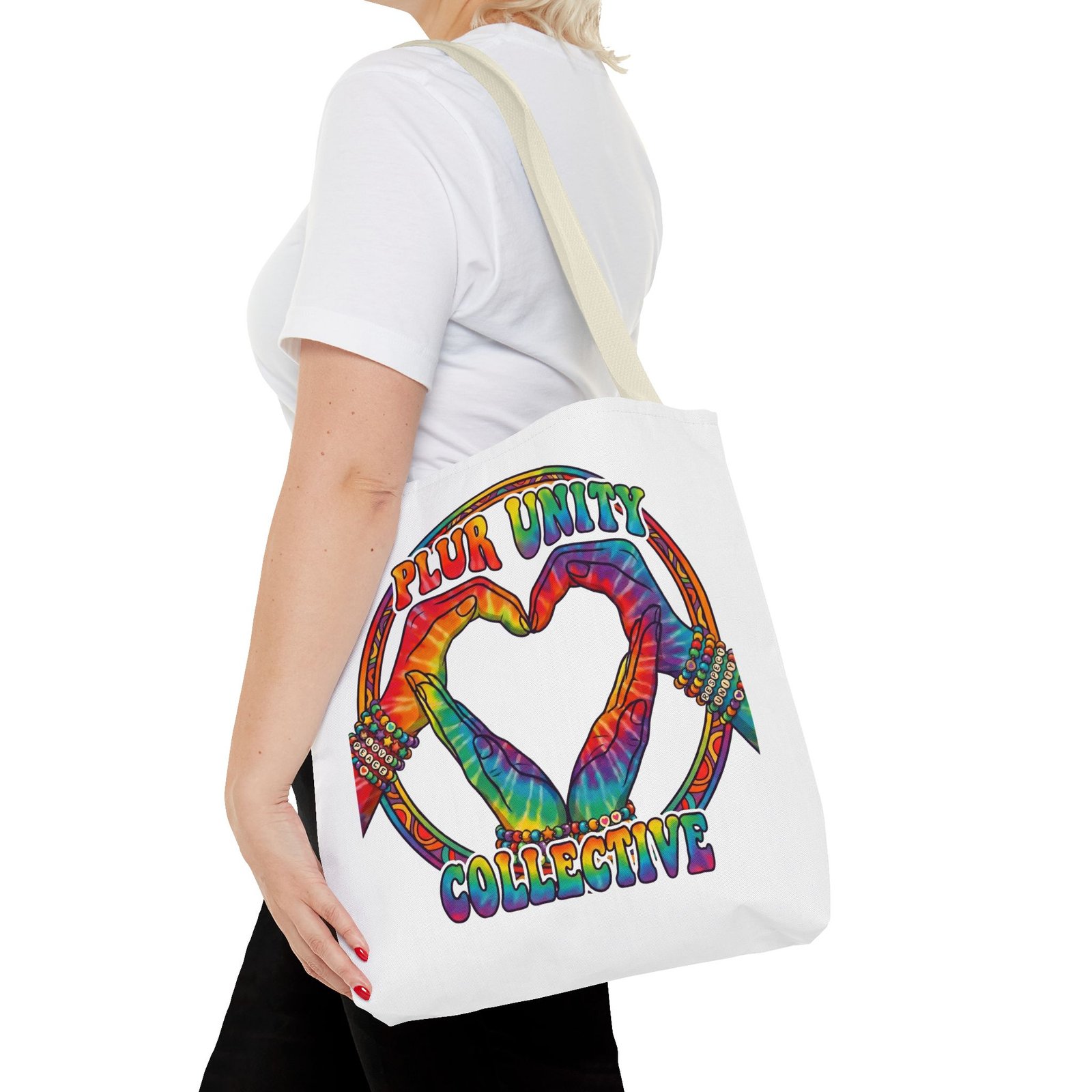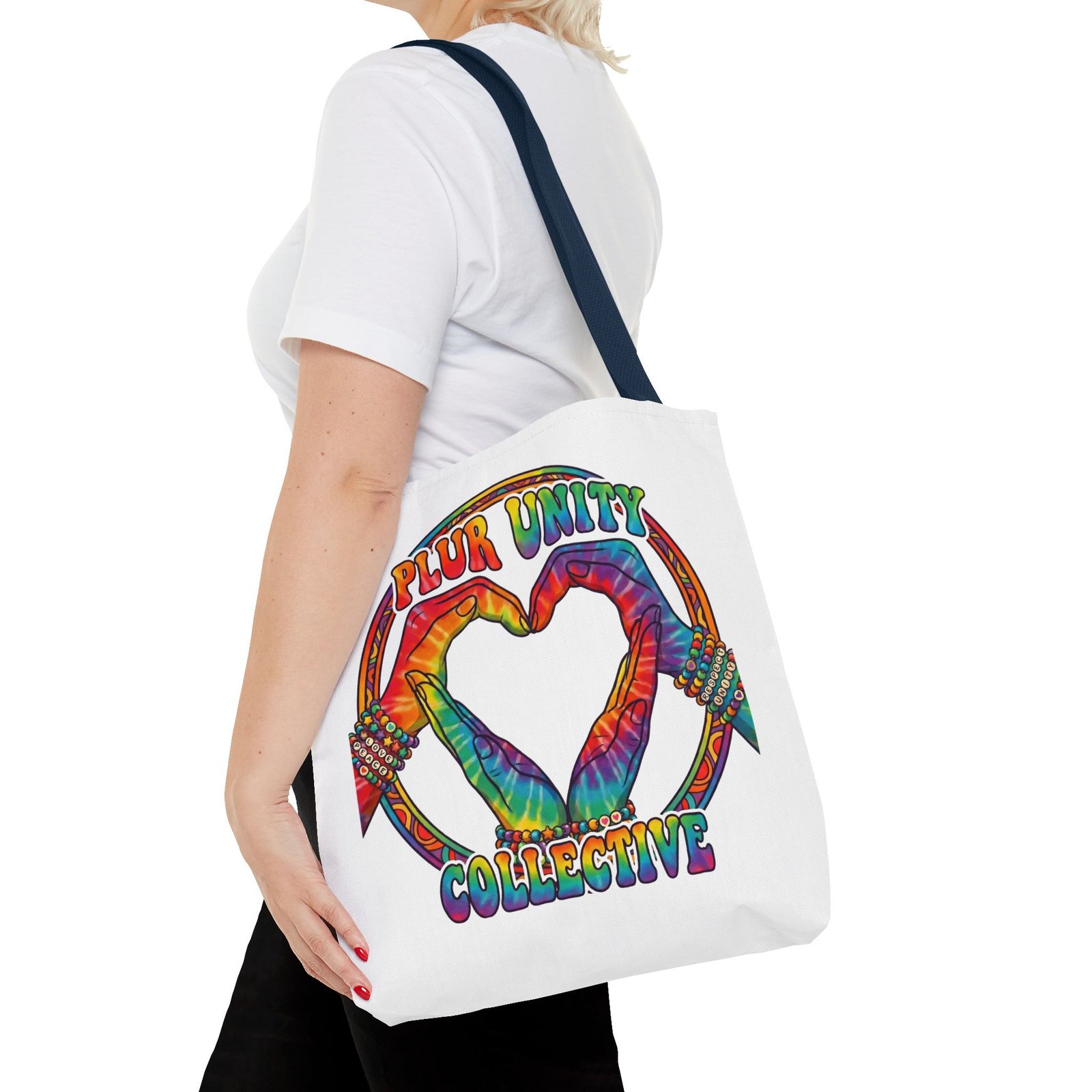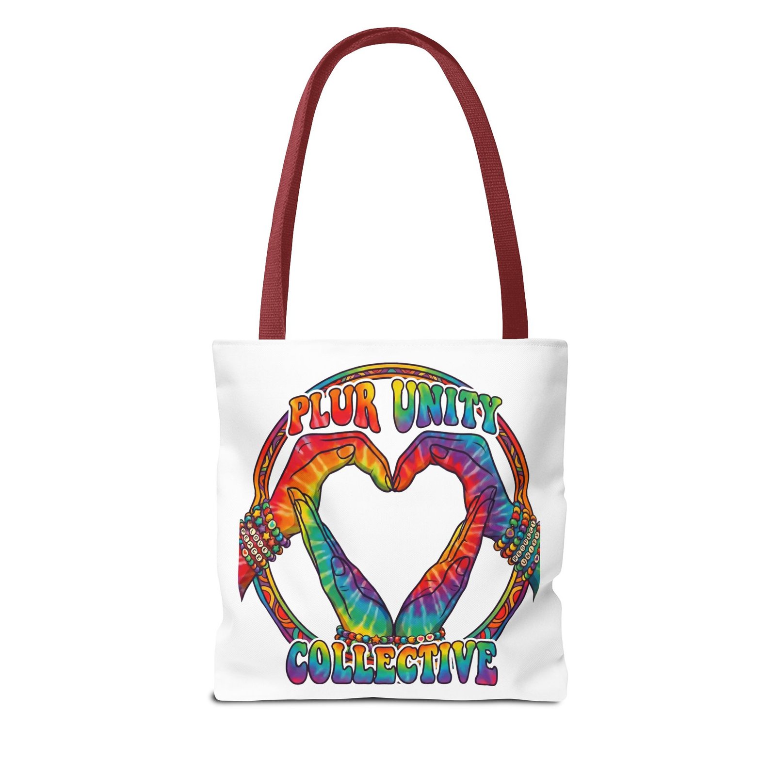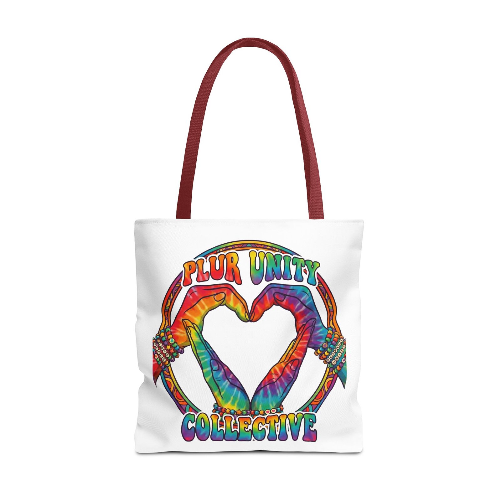 Bright, roomy, and built to carry both essentials and pride. This polyester tote features a vivid tie-dye inspired design of two hands forming a heart inside a rainbow ring, with “PLUR UNITY COLLECTIVE” rendered in joyful, colorful lettering. Lightweight yet durable, it holds its shape and dries fast—great for festival days, market runs, or everyday errands. The boxed corners add volume for bulky items, reinforced handle stitching gives confidence when you pack it full, and the interior non-woven laminate helps protect contents. Choose from five handle colors and three sizes to match your style and needs.
