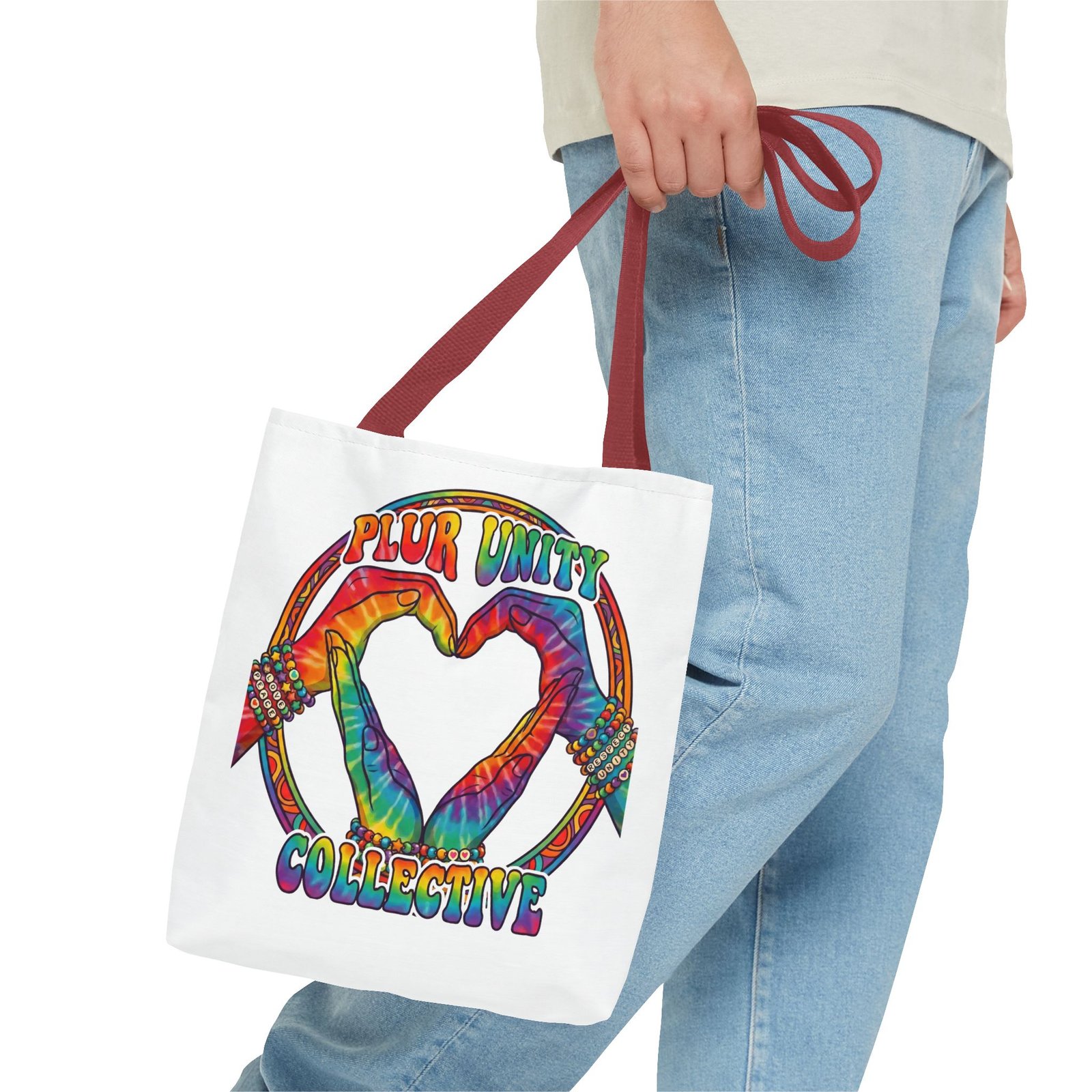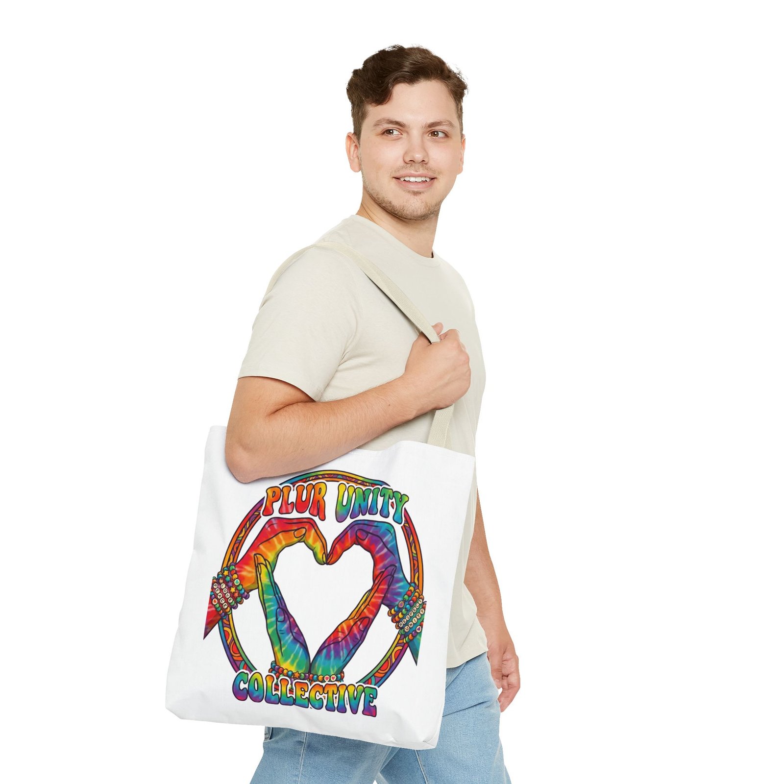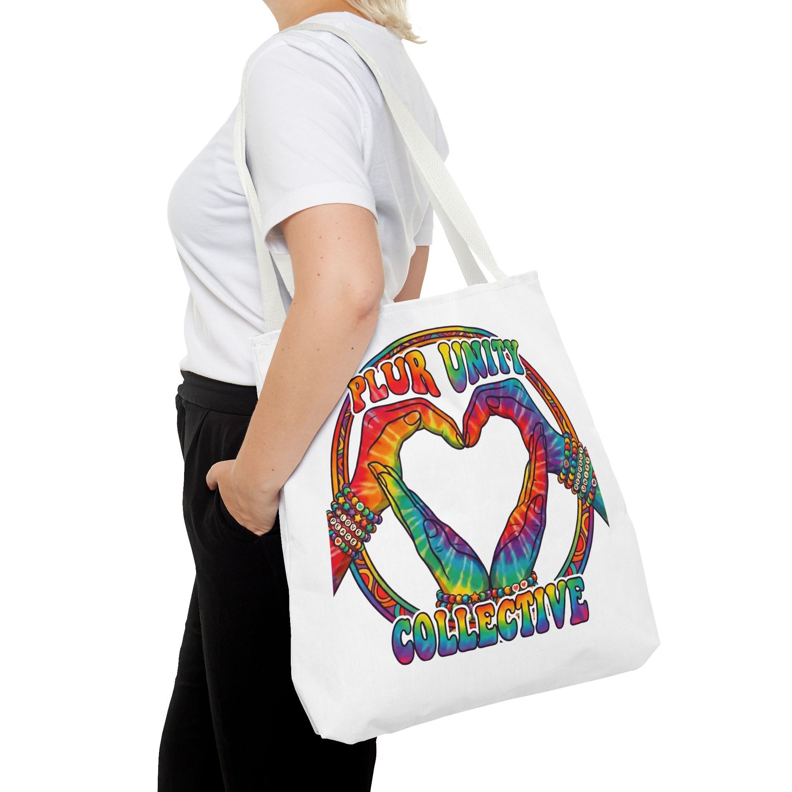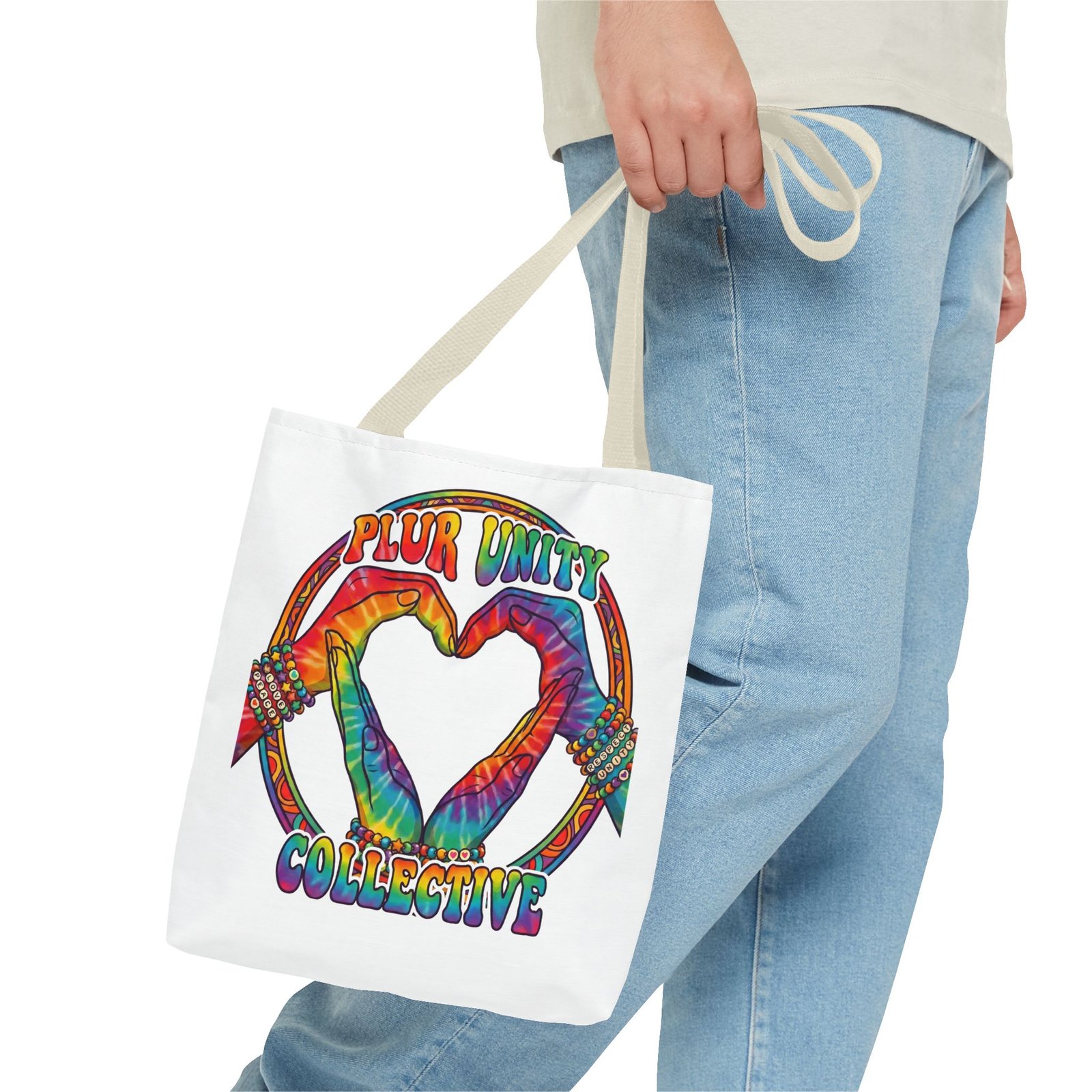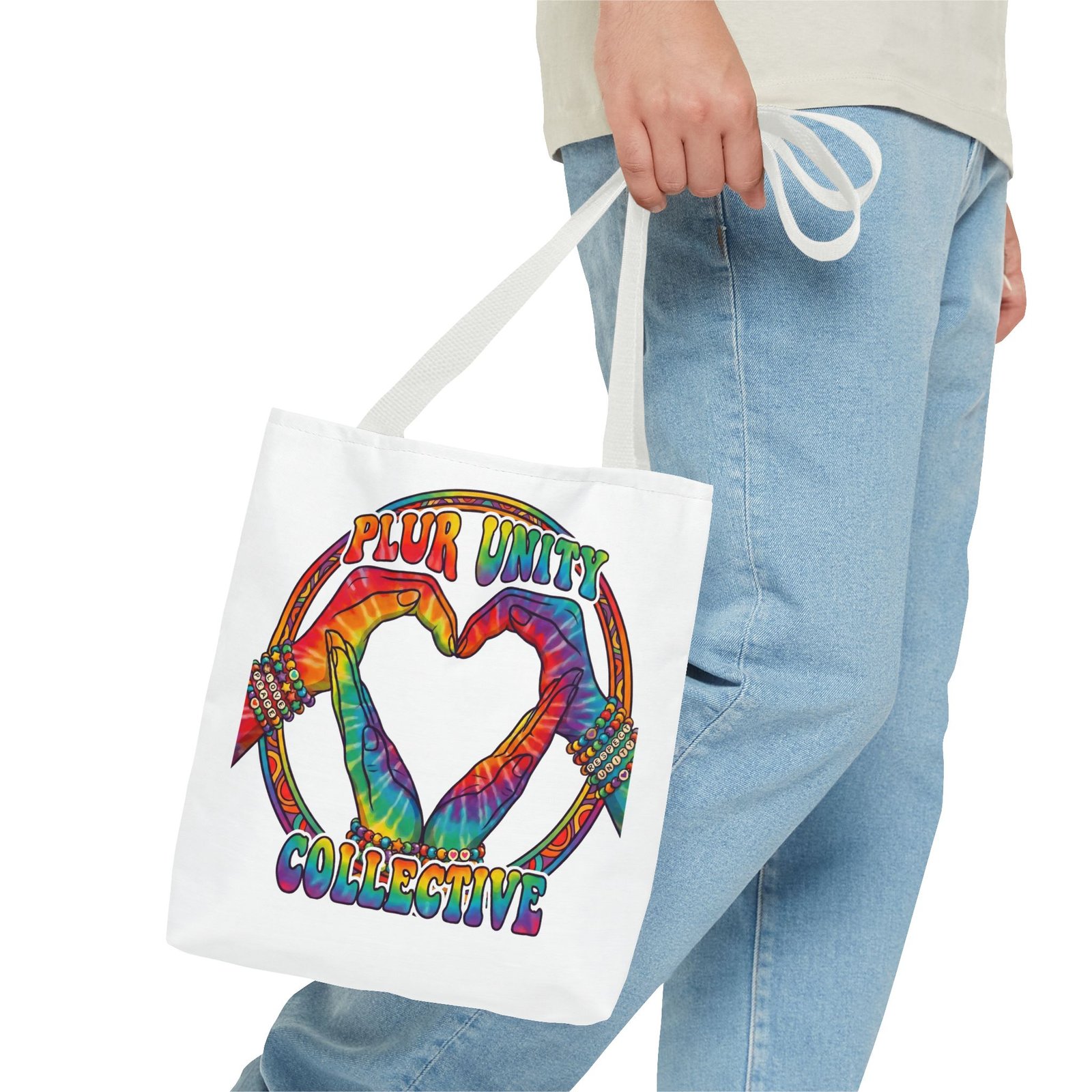 Bright, roomy, and built to carry both essentials and pride. This polyester tote features a vivid tie-dye inspired design of two hands forming a heart inside a rainbow ring, with “PLUR UNITY COLLECTIVE” rendered in joyful, colorful lettering. Lightweight yet durable, it holds its shape and dries fast—great for festival days, market runs, or everyday errands. The boxed corners add volume for bulky items, reinforced handle stitching gives confidence when you pack it full, and the interior non-woven laminate helps protect contents. Choose from five handle colors and three sizes to match your style and needs.