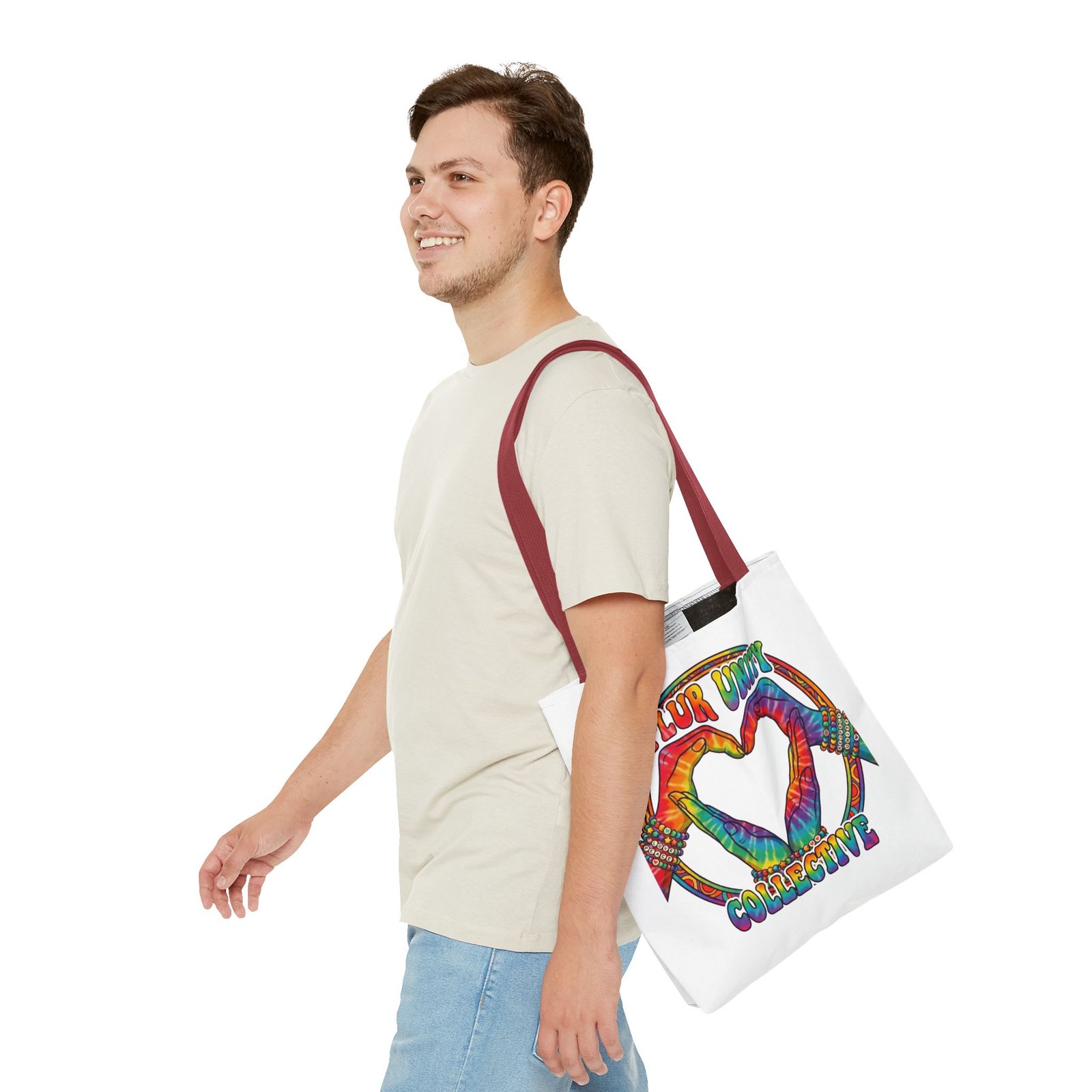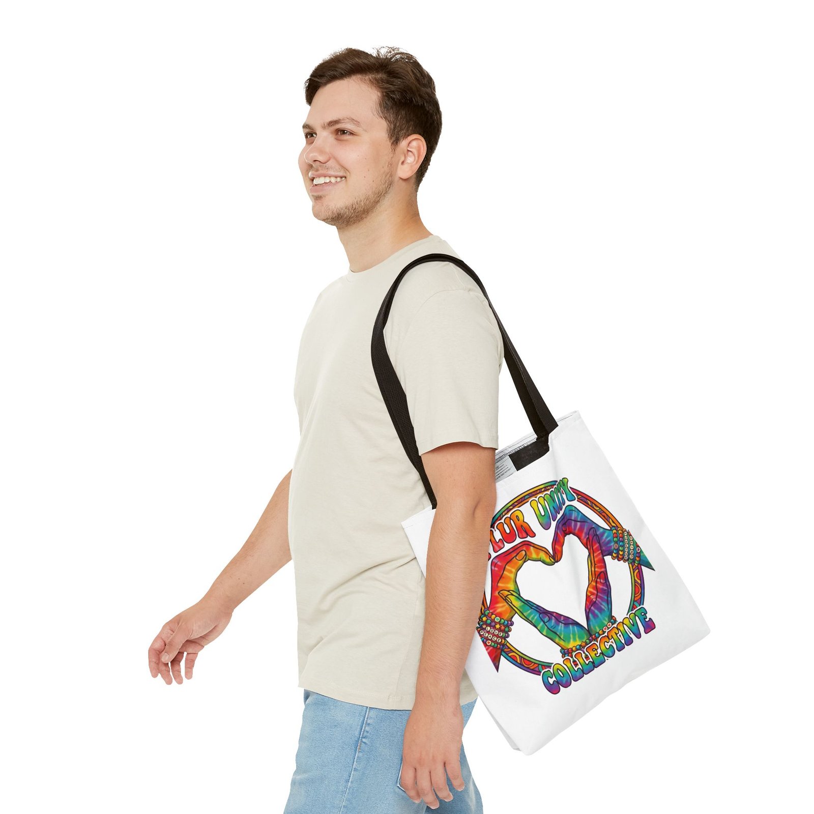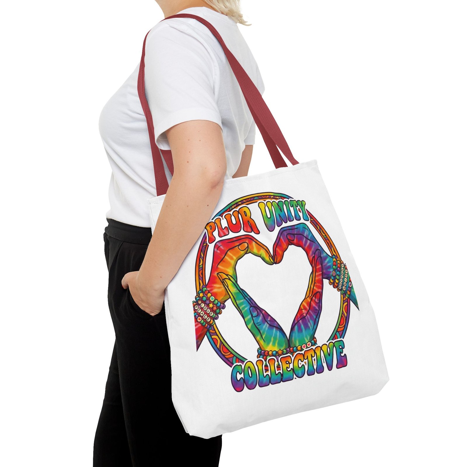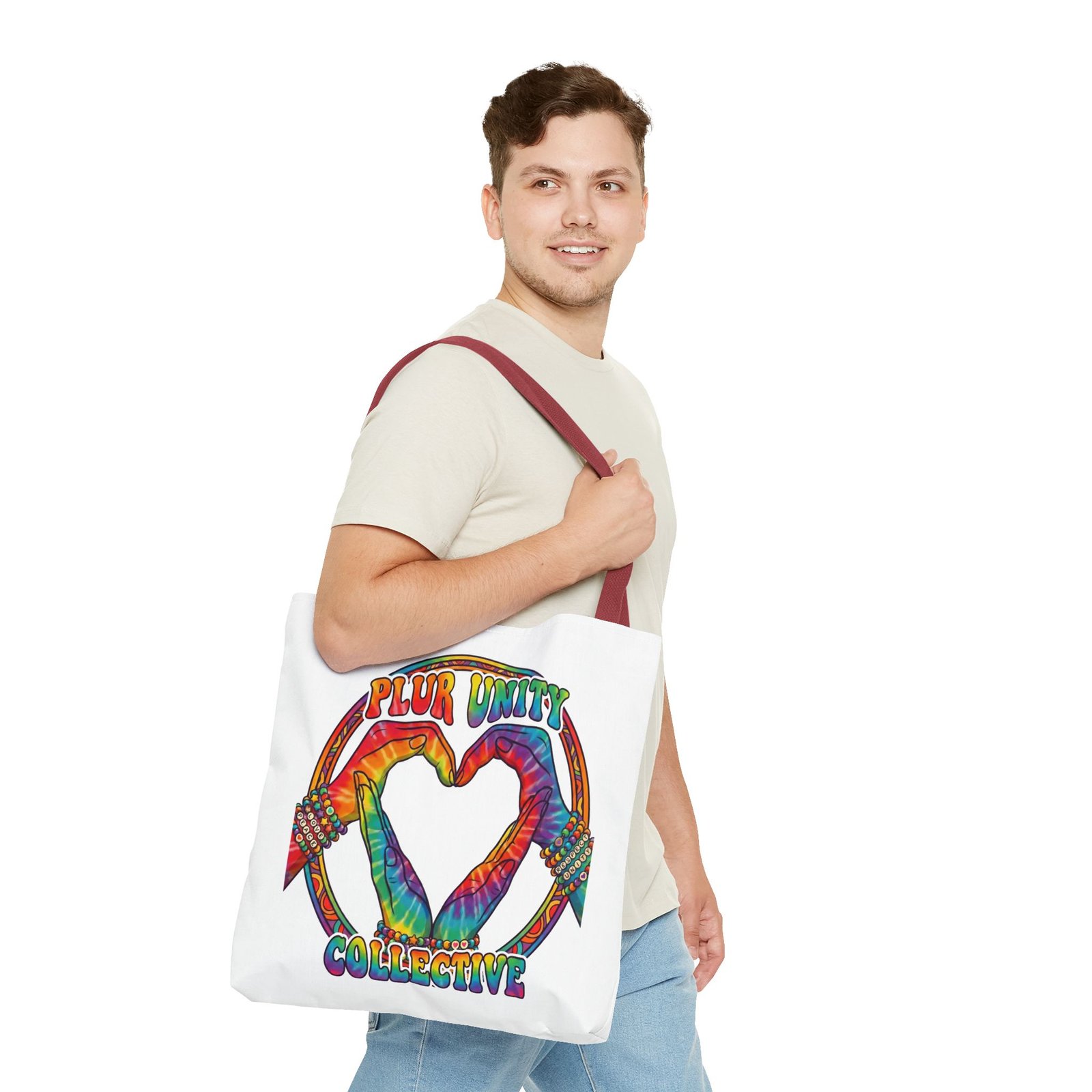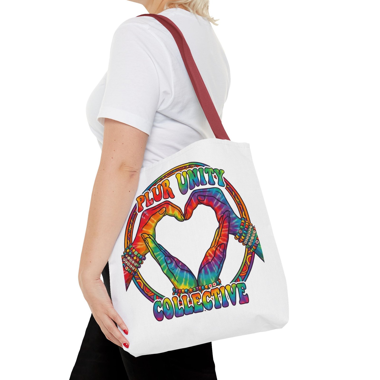 Bright, roomy, and built to carry both essentials and pride. This polyester tote features a vivid tie-dye inspired design of two hands forming a heart inside a rainbow ring, with “PLUR UNITY COLLECTIVE” rendered in joyful, colorful lettering. Lightweight yet durable, it holds its shape and dries fast—great for festival days, market runs, or everyday errands. The boxed corners add volume for bulky items, reinforced handle stitching gives confidence when you pack it full, and the interior non-woven laminate helps protect contents. Choose from five handle colors and three sizes to match your style and needs.