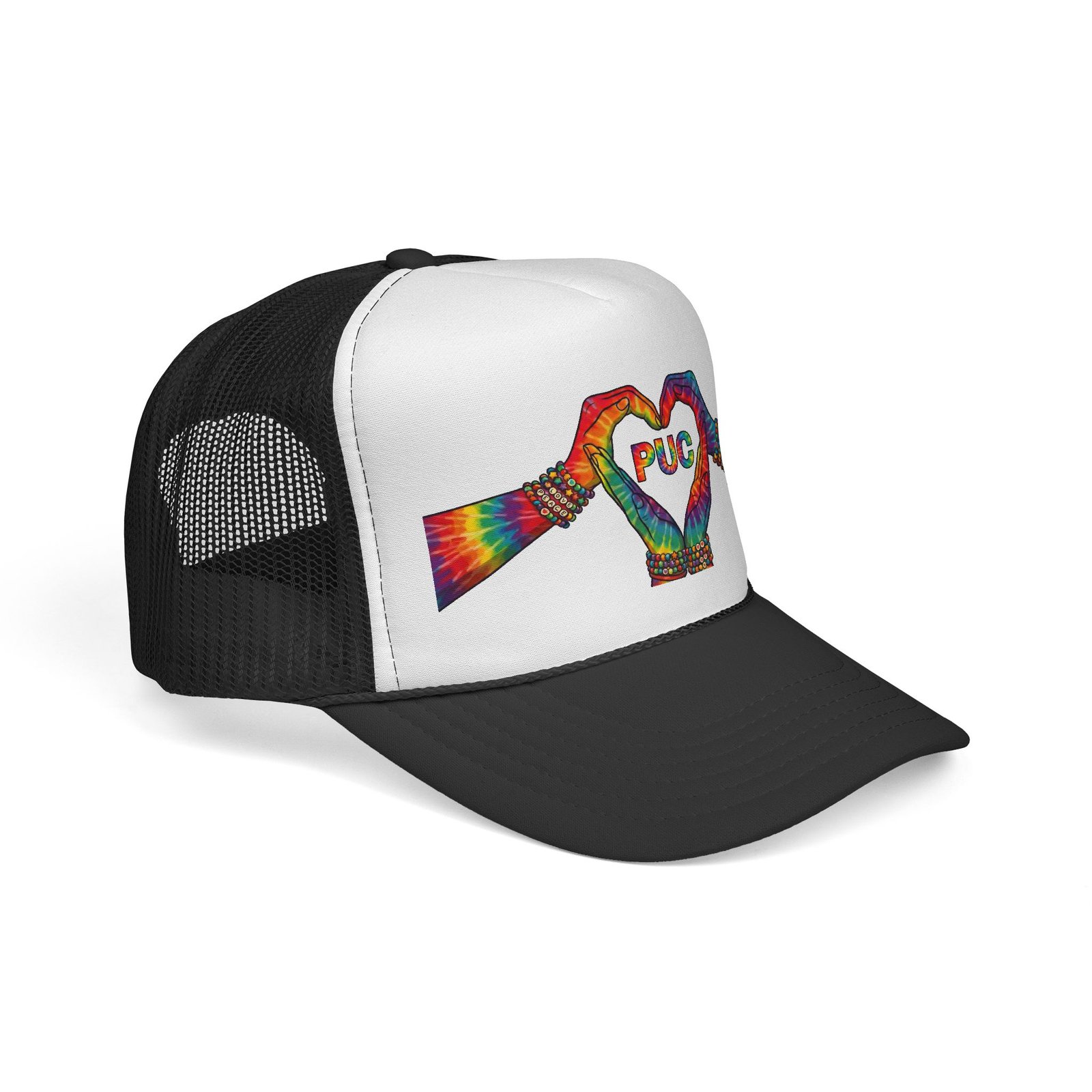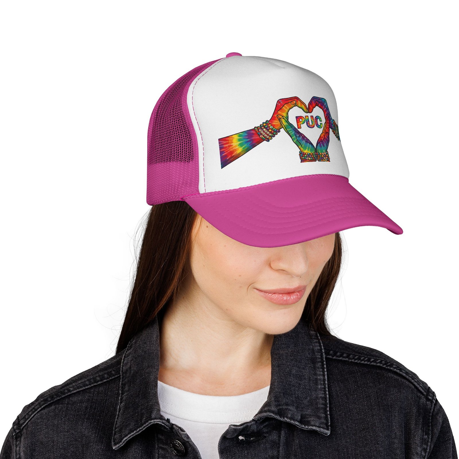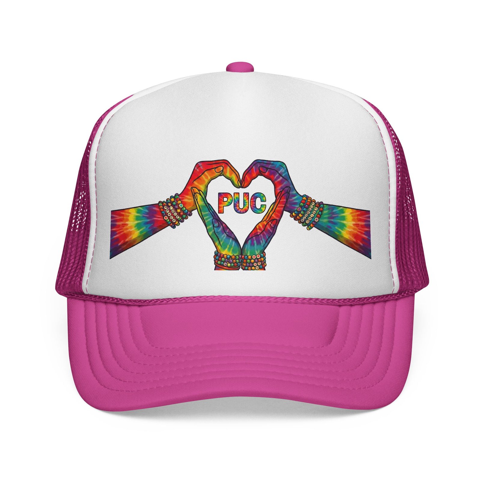 This trucker cap brings bright, hand-drawn energy to everyday wear. A vivid, tie-dye inspired pair of hands forms a heart across the foam front, framing a cheerful ‘PUG’ detail at the center. The white front panel makes the colors pop, while the breathable mesh back keeps things airy on sunny days. Adjustable snap closure and a structured visor give it a familiar trucker silhouette that molds to your style as you wear it. Wear it to add a playful, colorful accent to weekend walks, dog-park hangs, festival days, or just whenever you want to carry a little joy on your head.